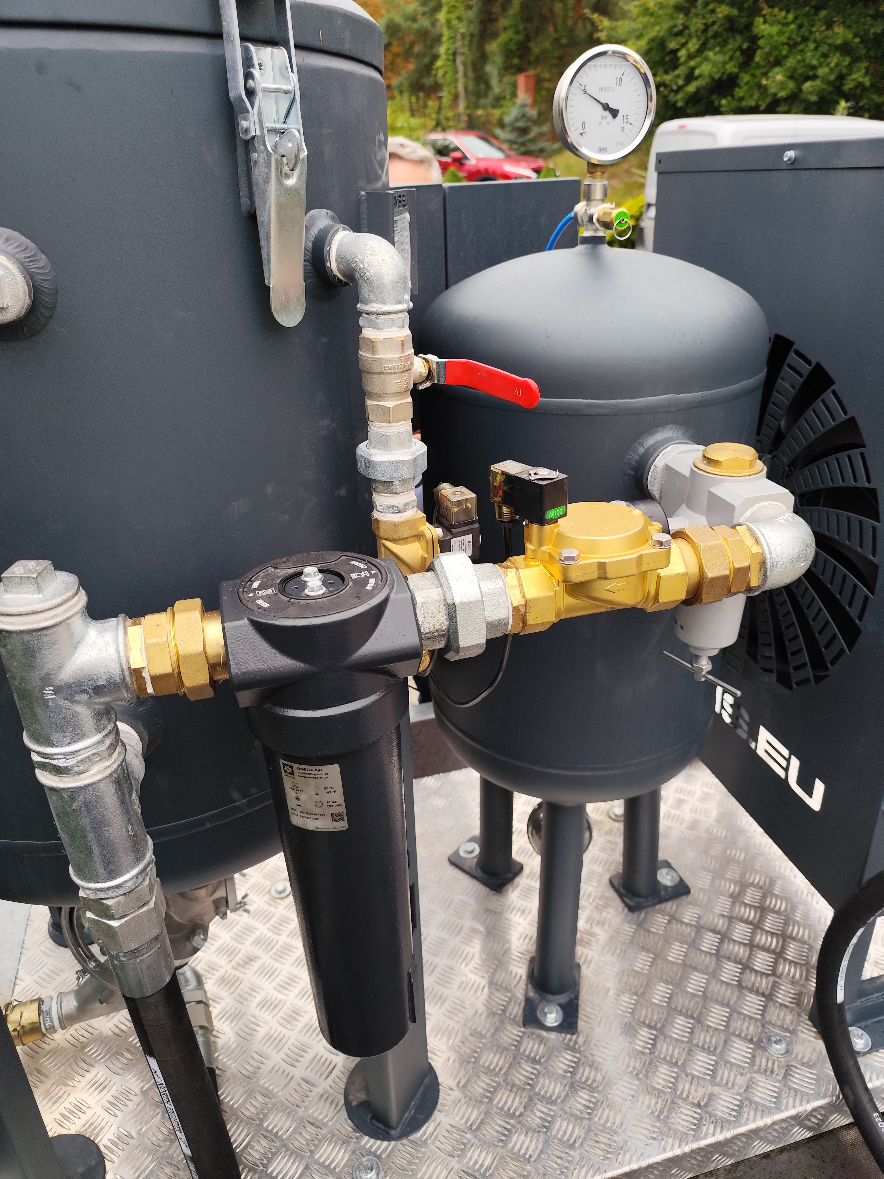 Panowie, mam taki problem. Zrobiliśmy piaskarkę mobilną ale ciśnienie gdzieś znika. Nie bardzo możemy dojść gdzie to się dzieje. Może od początku. Sprężarka spalinowa 12 bar 3.5 m3 Rotair MDVN 53 Eco 5 4900 l/min z tego wychodzi 3/4 cala do filtra i do chłodnicy, z niej do zbiornika 77 litrów, który także służy jako osuszacz - na nim manometr. Potem wychodzimy na zawory i znowu filtr i do zbiornika 200l i na wyjście. Odpalamy sprężarkę. Nabijamy 77 litrów do 9-10 bar. Otwieramy zawór i powietrze z tego zbiornika zlatuje, sprężarka chodzi na 10 bar ale w układzie jest cały czas 1. Może ktoś się wypowie kto ogarnia temat bo mi już ręce opadają. Link do zdjęć: https://drive.google.com/drive/folders/ ... sp=sharing