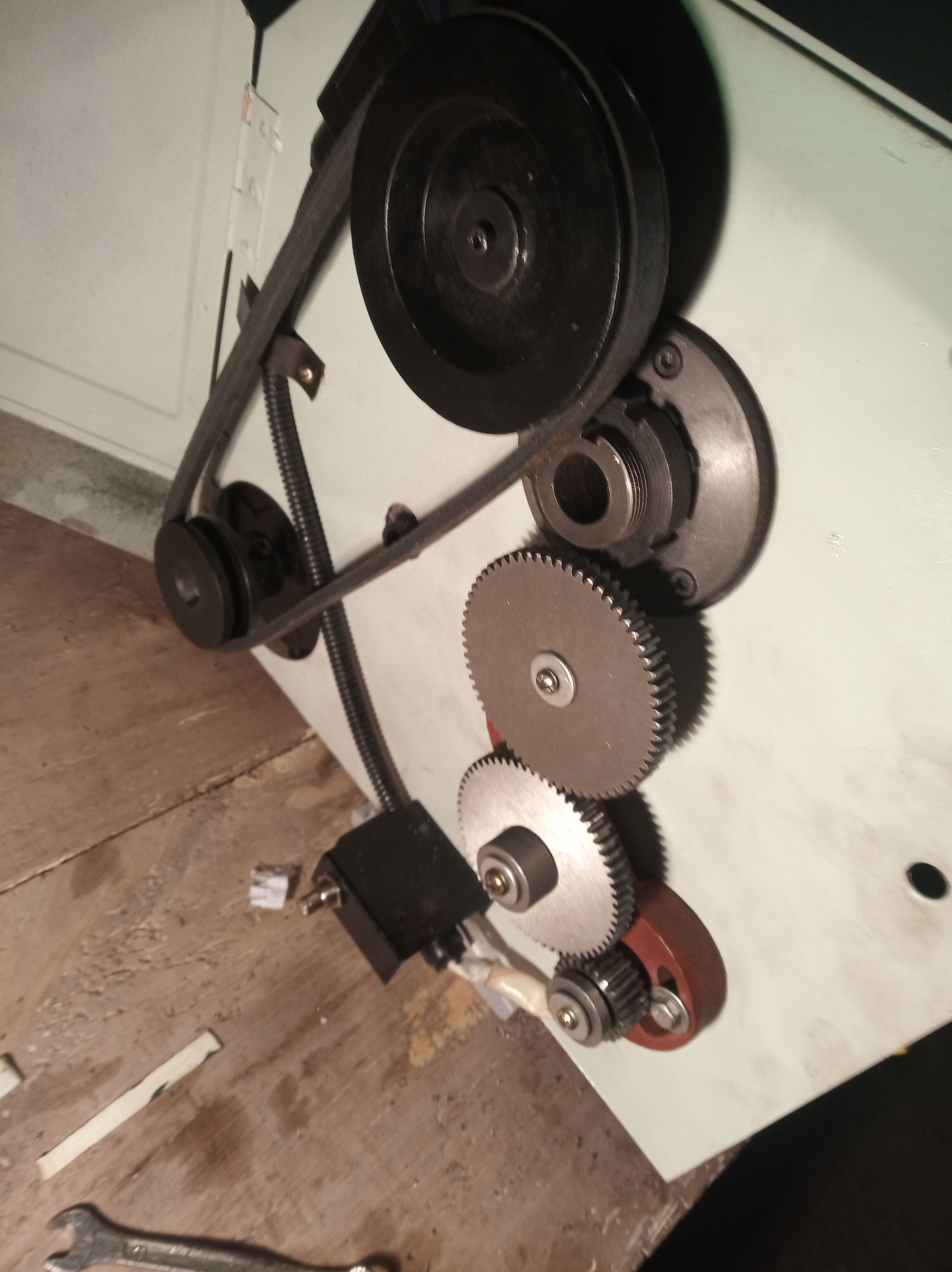 A ja pięć lat używałem taką tokarkę, ale z silnikiem 0,75kw. Jednego razu przy cięciu zakleszczył się nóż w detalu, silnik się zatrzymał, na szczęście pracował na 25hz więc nie miał pełnego momentu obrotowego, ale i to wystarczyło do częściowego uszkodzenia koła zębatego zaznaczonego strzałką.